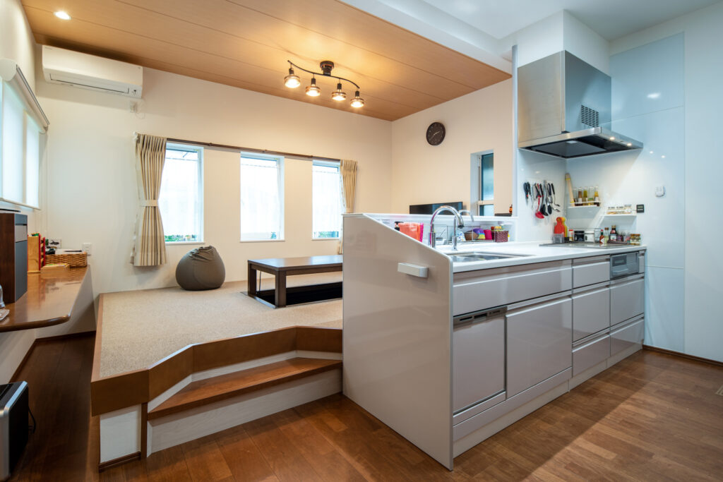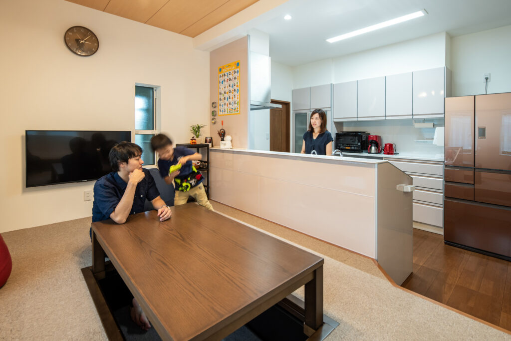 さらに、フロアレベルで上げているため、掘りごたつでくつろぐ家族と、キッチンに立つママが同じ目線の高さで話ができます。