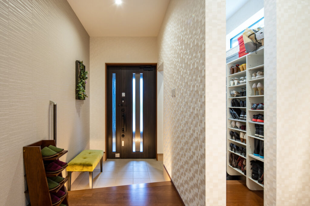 シューズインクローゼットに通り抜けられる通路を用意し、ご家族の出入りをスムーズにしながら来客時はきちんと見せ場を残せる設計。