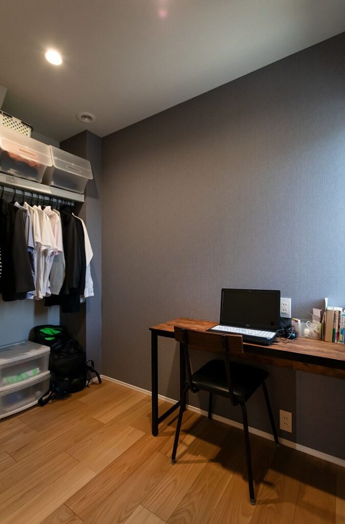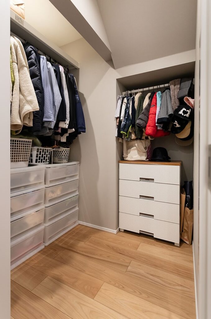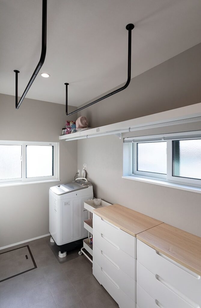 ランドリールームには物干しを設置し、さらに収納スペースも完備。洗濯、干す、収納までがすべて一ヶ所で完結できるため、移動が一切なく、家事がシンプルで効率的に行えます。