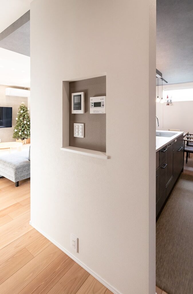リビングには「スイッチニッチ」を採用し、スイッチやリモコン類をまとめて配置しています。サイズや厚みが異なるこれらを一ヶ所に整然とまとめることで、スッキリとした印象を与え、空間の美しさを引き立てています。