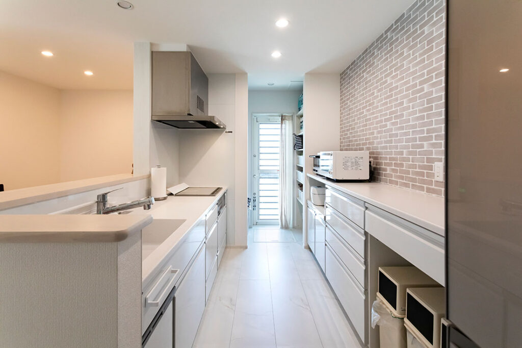キッチンは、他の部屋とは異なる雰囲気を演出したいというご希望により、レンガ調の壁紙を採用。キッチンに立つたびに心地よさを感じる奥様のお気に入りの空間です。