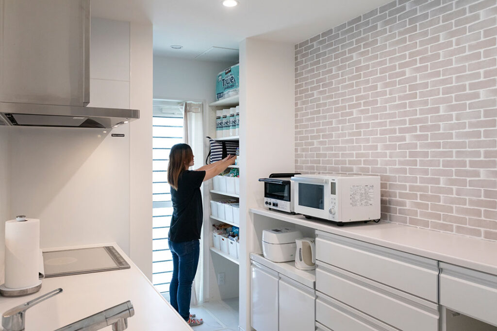 また、キッチンの奥には大容量のパントリーを設置しており、収納力抜群で、毎日の家事がスムーズに進む設計になっています。