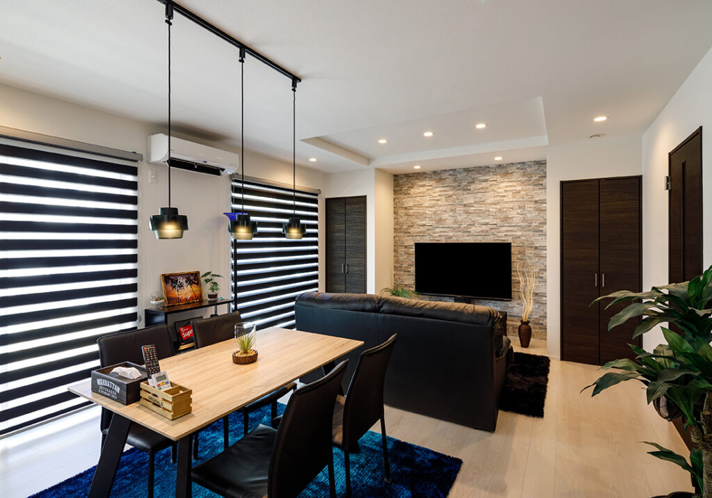 明るめのフローリングと、落ち着いたトーンのアクセントクロスが調和するLDK。