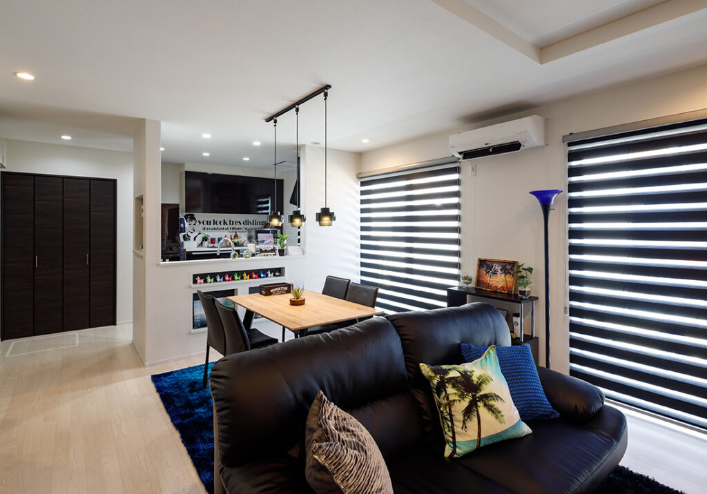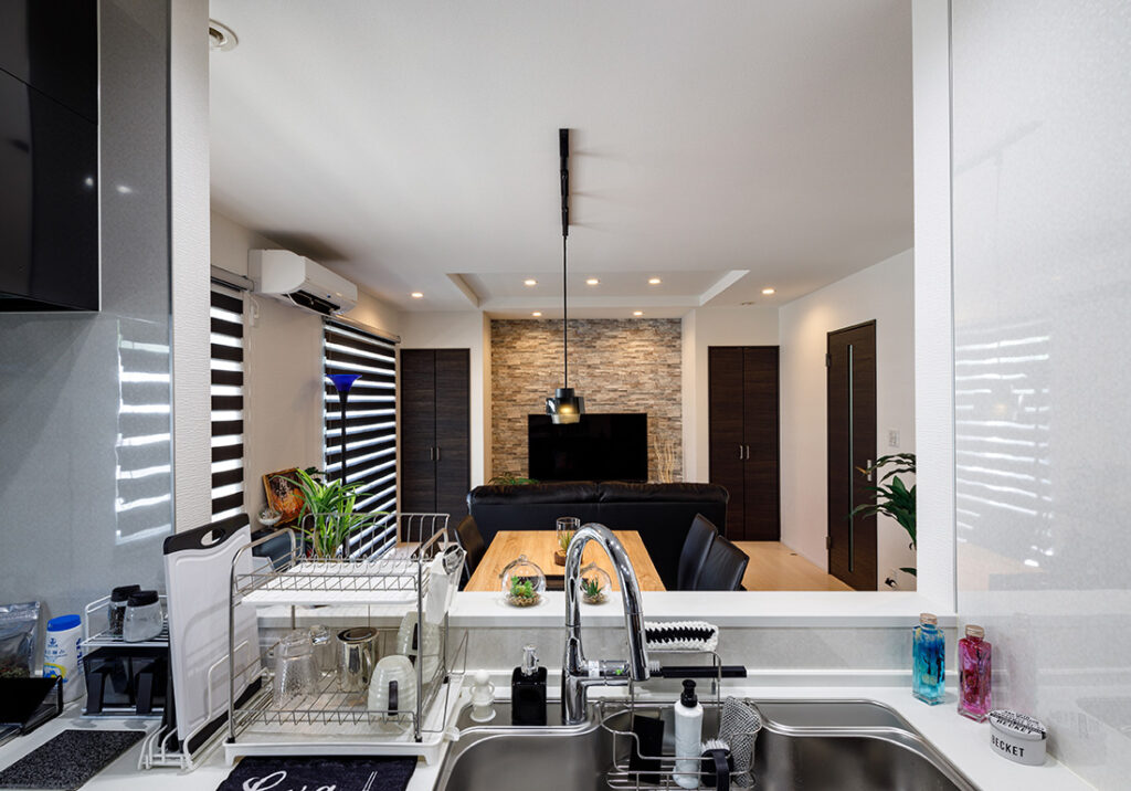 LDKはゆるやかにゾーニングされ、キッチンの生活感がリビングに漏れにくい設計。