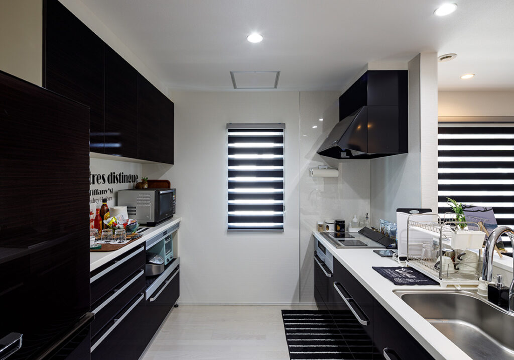 広々とした動線設計で、調理中も家族との会話やテレビ鑑賞を楽しめるキッチン。