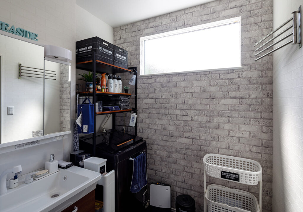 レンガ調のアクセントウォールが印象的な洗面室。