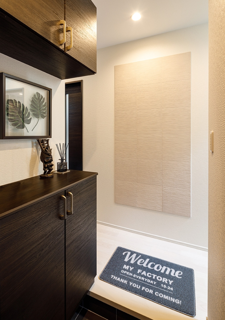 玄関のアクセントウォールには「エコカラット」を採用。