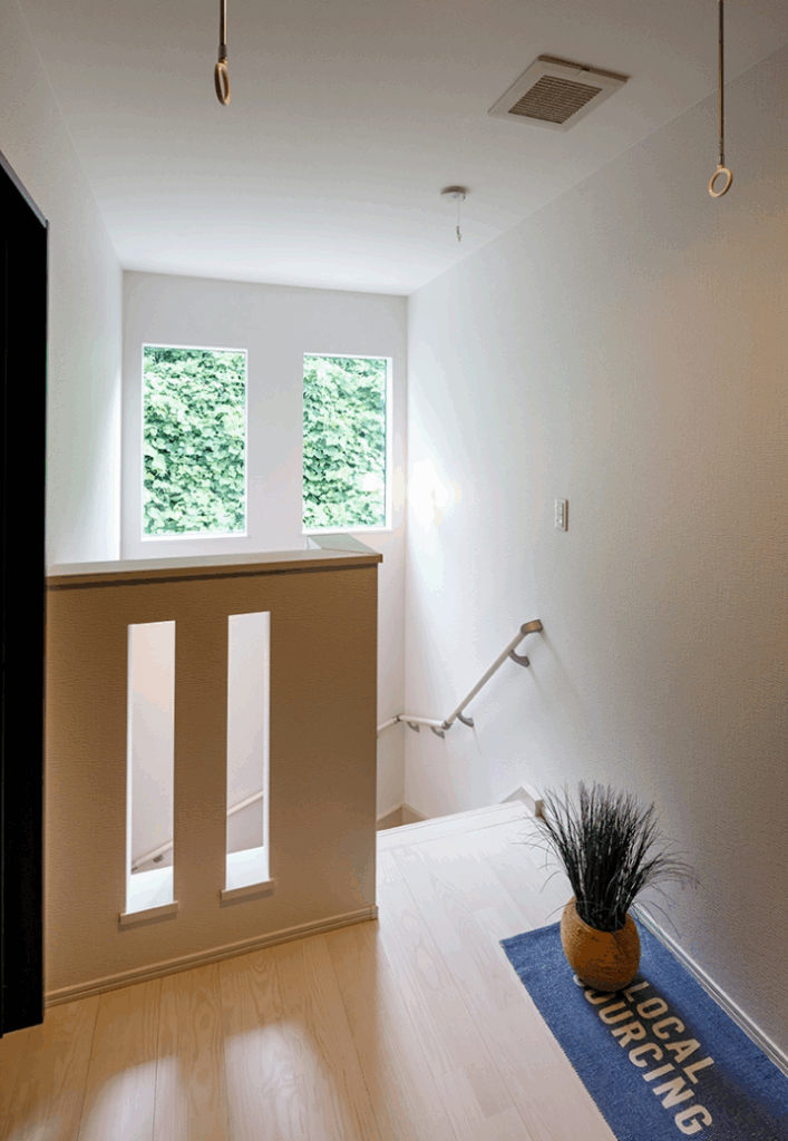 大きな窓から自然光が降り注ぐ明るいホール。洗濯物の室内干しスペースとしても活用でき、 日々の家事をより快適にサポートします。